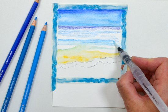 4. A permet fölött színezzük a vizet homokszínűre. Ezután váltsunk világos türkiz árnyalatra, majd a horizont felé a víz színét kék árnyalatokkal mélyítjük el. Hagyjunk vízszintes fehér foltokat, amelyek később a hullámok gerincét jelképezik majd.