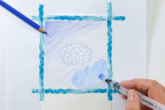 3. Árnyékoljuk sötétkékkel a tengeri sün körüli területet. Fessük meg a hátteret az akvarell ecsettel. Ha élénk hátteret szeretnénk, cseppentsünk vízcseppeket a kissé nedves színbe.
