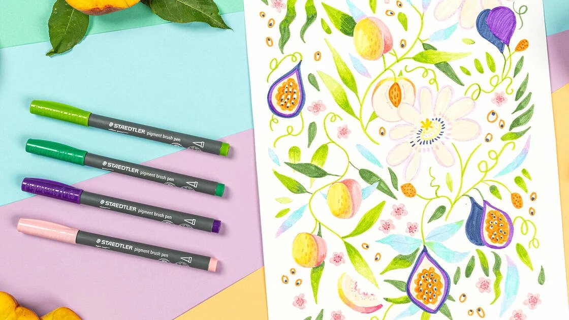 A STAEDTLER „Pigment Arts” ecsetirónjaival igazán üde és színpompás alkotásokat készíthetünk, amelyek kellemes és harmonikus színeikkel feldobják környezetünket. A STAEDTLER útmutatójának segítségével könnyedén életre kelthetjük ezt a vidám, gyümölcsös posztert, ami megidézi a nyár hangulatát otthonunkban. A papíron kívül bátran kísérletezhetünk más alappal is, hiszen a „Multi Ink” tinta a legtöbb felületen vízálló és az UV-sugárzásnak is ellenáll.
