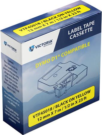 Feliratozógép szalag, 12 mm x 7 m, VICTORIA TECHNOLOGY, sárga-fekete
