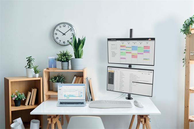 A Vertical Stacking Dual Monitor Arm két monitor stabil és biztonságos függőleges elhelyezését kínálja.